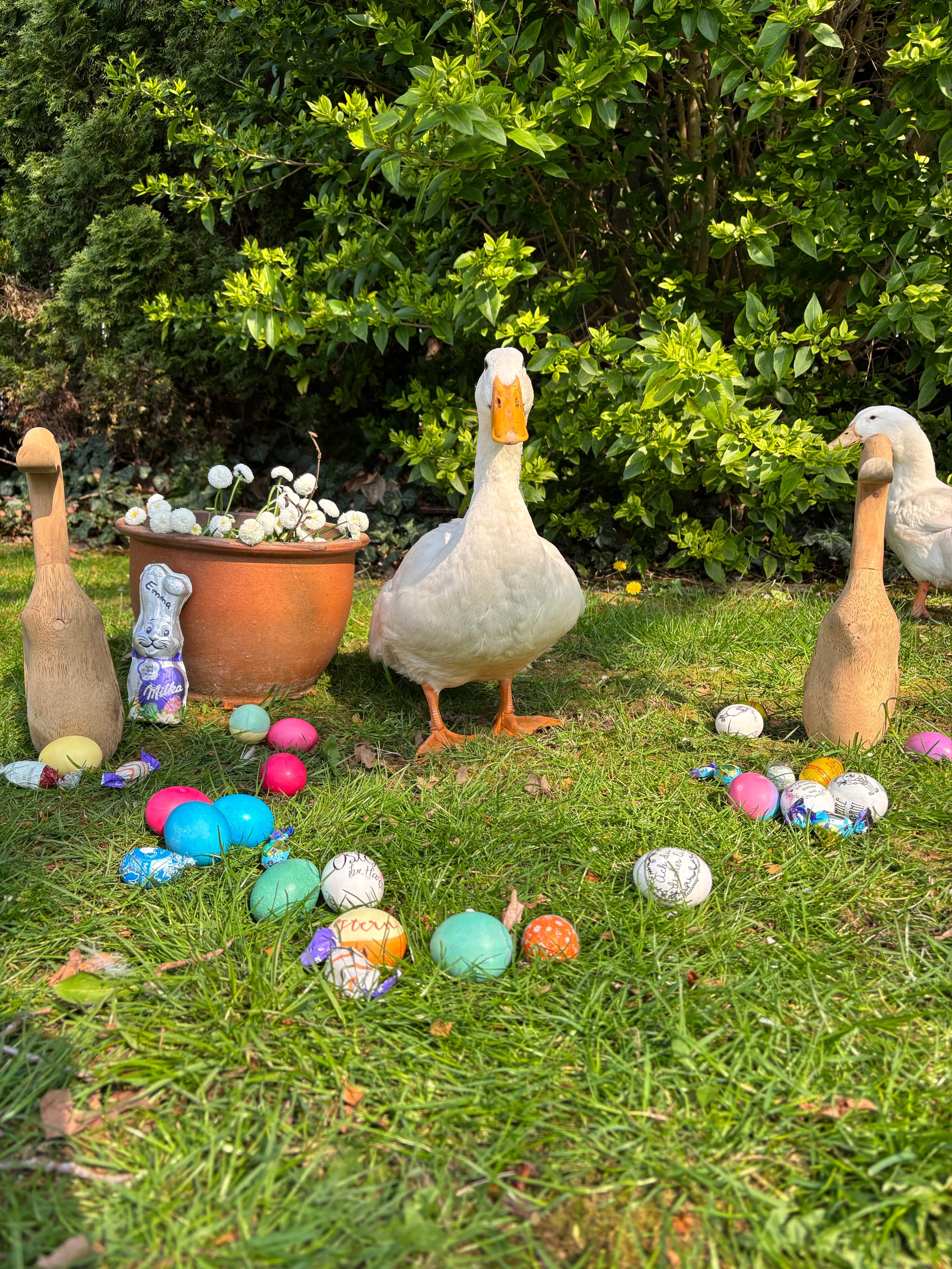 Hilde und Wilm, unsere beiden Enten, waren natürlich dieses Jahr mit dabei. Sie haben nicht gesucht, aber sehr aufmerksam beim Verstecken zugesehen.