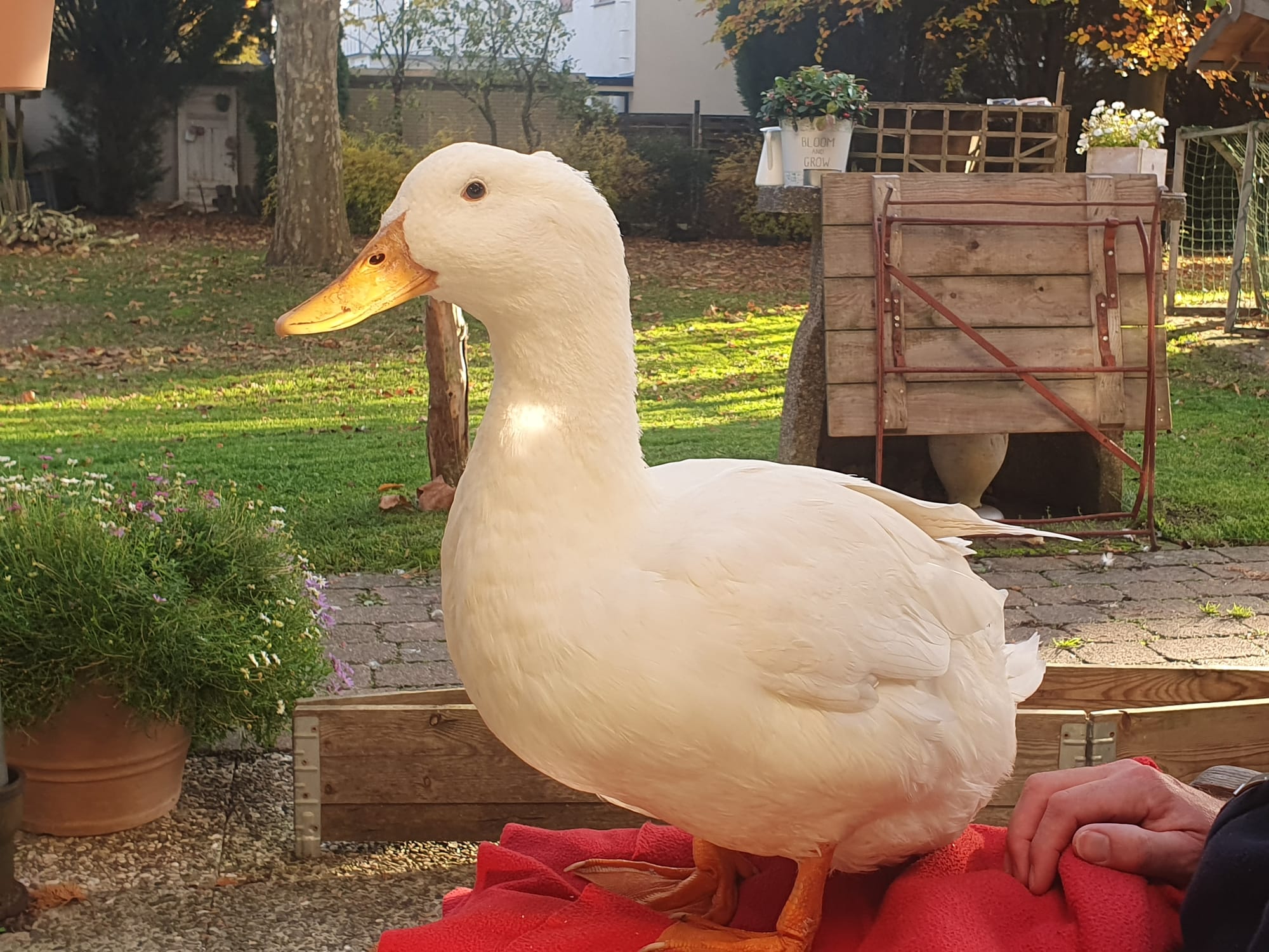 Sie stand draußen vor dem Gartenzaun und schnatterte aufgeregt mit Wilm, unserer zweiten Ente, die auf der anderen Seite am Zaun stand.