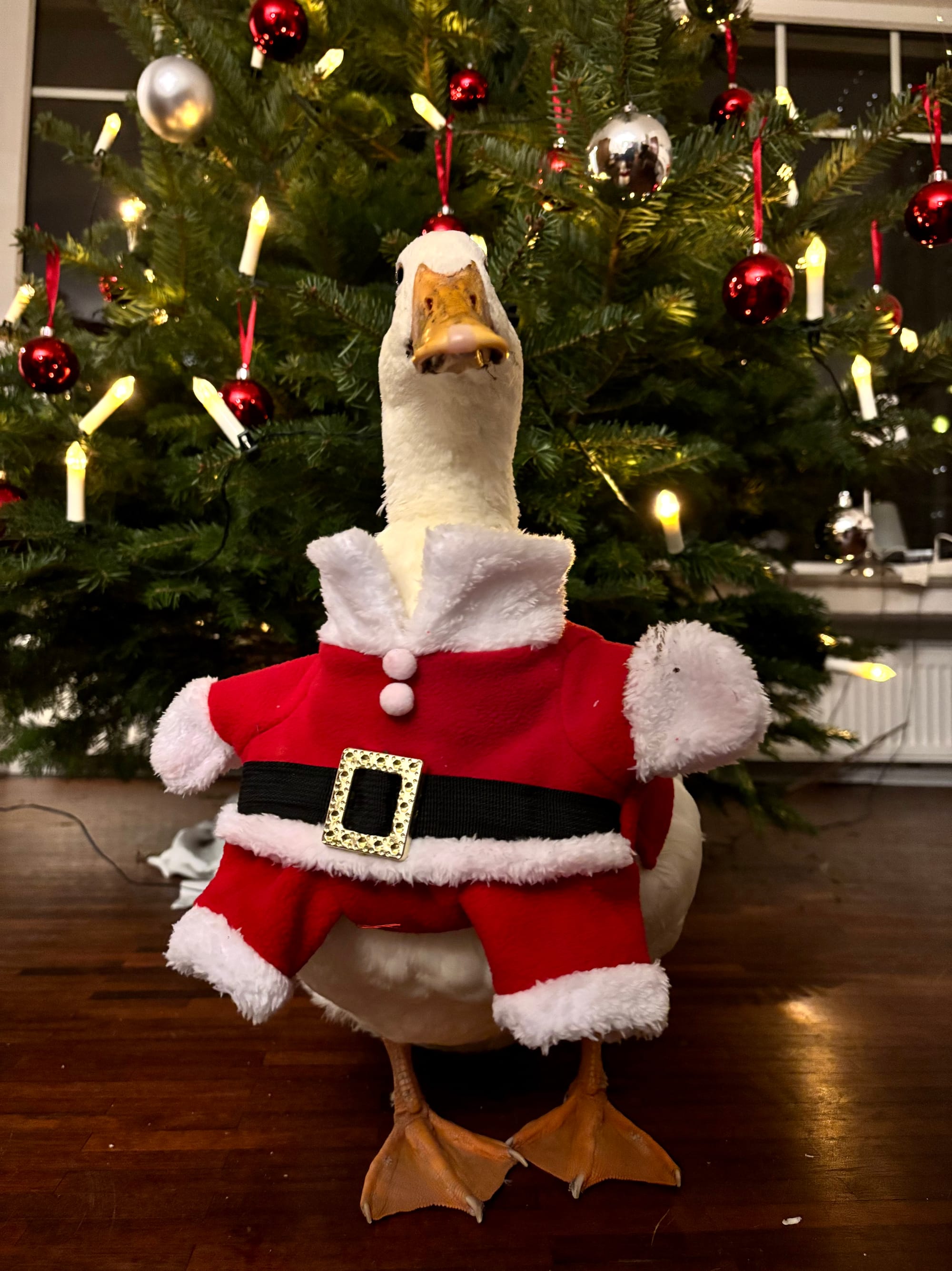 Wir hatten ein kleines Nikolauskostüm zuhause – nicht für Enten gedacht, versteht sich. Trotzdem zogen wir es ihr über den Kopf. Hilde hatte offensichtlich nichts dagegen.