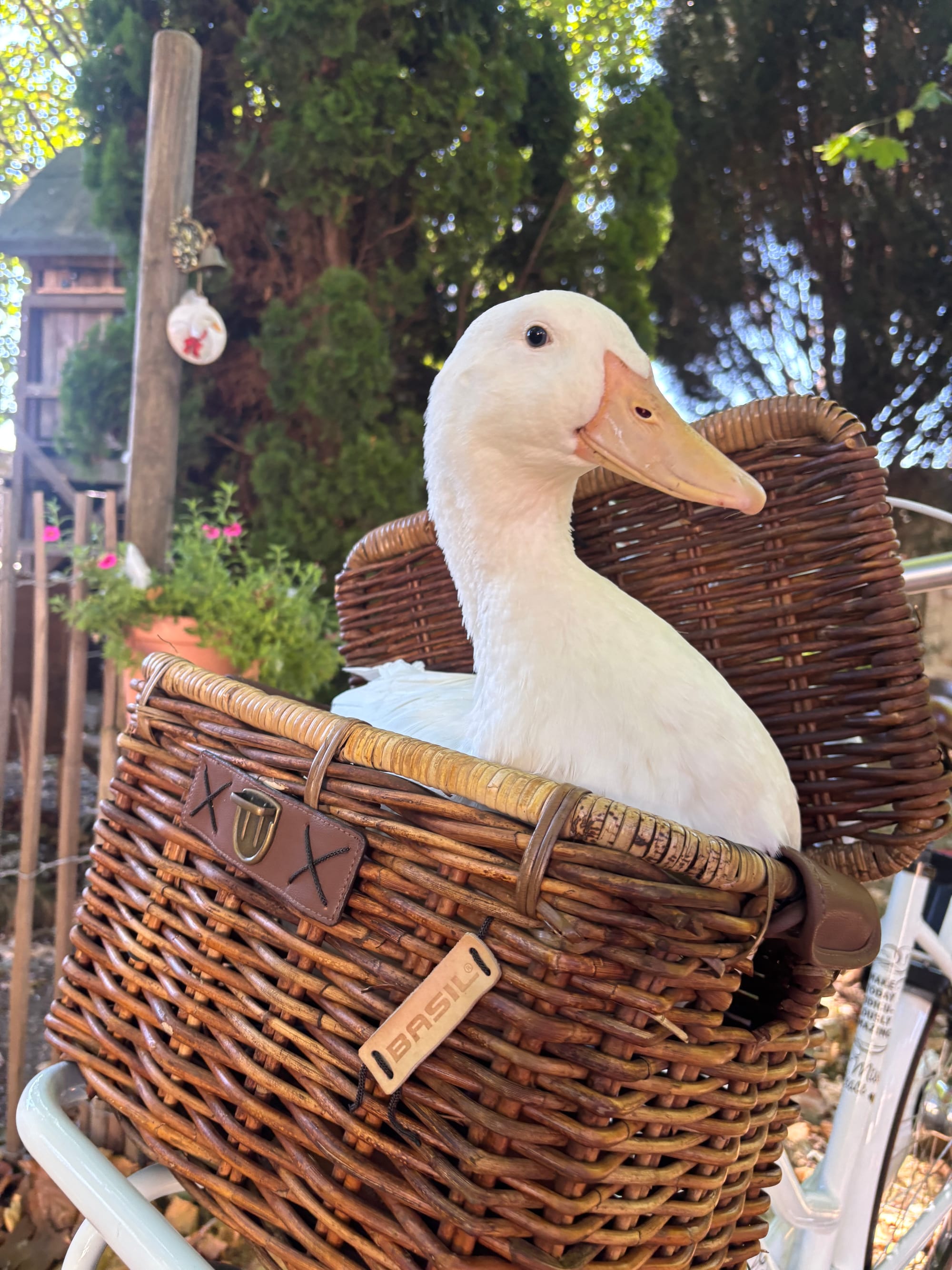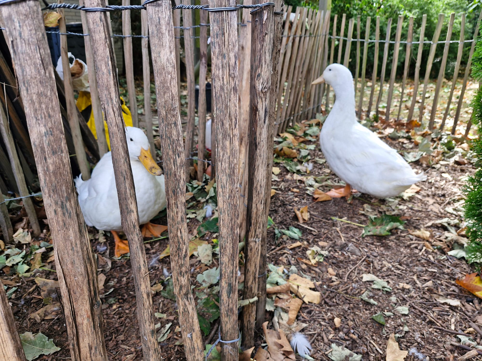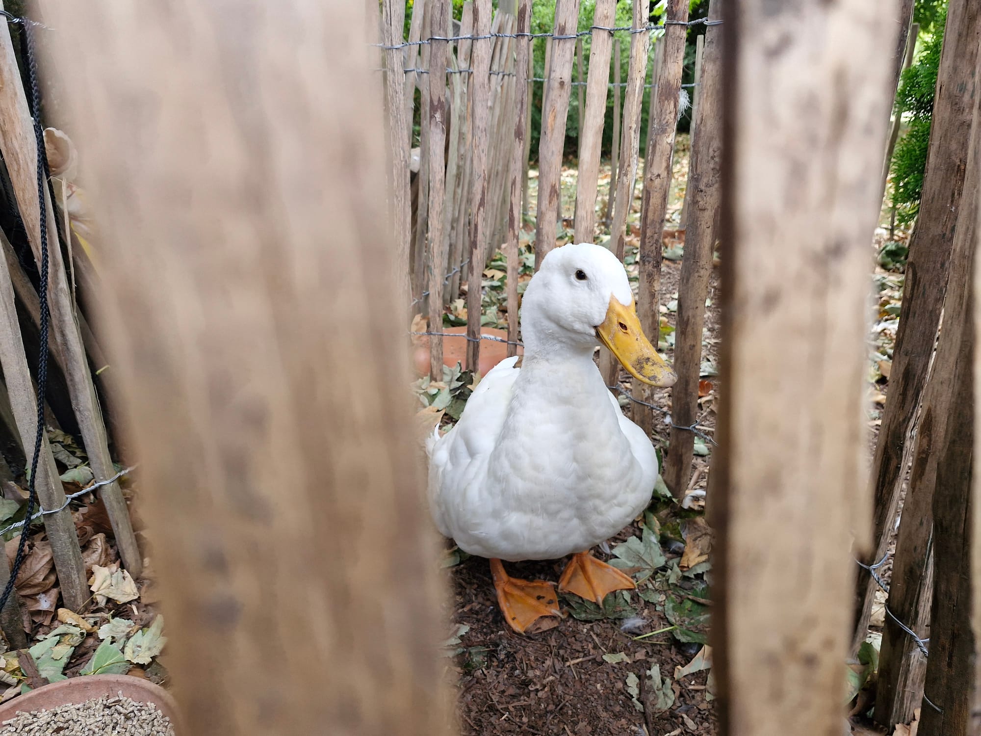 - und wie fröhlich es mich macht, diesen Blog zu schreiben, während ich unseren Enten beim quirlig-bunten Alltag zusehe. Obwohl ich aktuell traurig bin, weil ich Hilde gerade sehe, die sehnsüchtig vor der verschlossenen Zauntür steht.