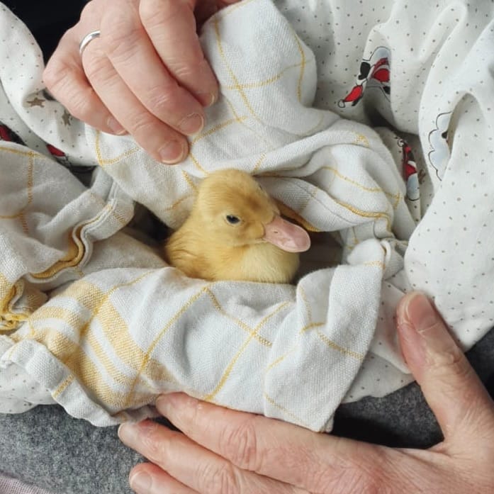 Die Ankunft bei dem Bauern war wieder sehr schräg, eigentlich noch viel schräger als am Tag zuvor. Vielleicht hätte ich nicht von Hildes erster Nacht im Bett - samt Wärmeplatte - berichten sollen. Ein Küken im Bett, Rundumbetreuung eines einzelnen Entleins, die erneute weite Fahrt von Bünde bis nach Magdeburg für wieder nur ein Küken – und das zwei Tage in Folge – fanden der Bauer und seine Frau schlicht und einfach verrückt und bezeichneten uns auch genauso. („Da sind die Verrückten ja wieder!“)
