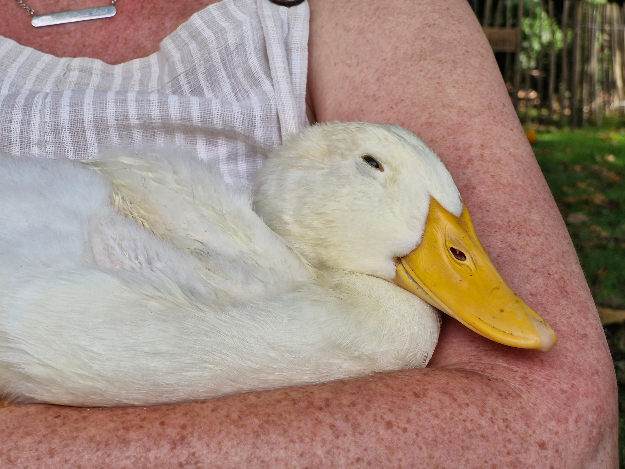 Zufällig traf ich sie im Regen um diese späte Stunde draußen – und äußerst motiviert wollte sie sich unserer Suche anschließen. Das war eine hochgradig interessante Situation, weil unsere Nachbarin blind ist. Viel sehen konnten meine Tochter und ich allerdings auch nicht, aber unsere Nachbarin hat sich auf ihr Gehör verlassen und uns entsprechend dorthin geleitet, wo sie meinte, ein Rascheln zu hören. Tatsächlich lagen die Enten unter dem Laub, direkt am Zaun – von uns aus gesehen hinterm Busch. Von unserer Seite des Gartens wären wir nur sehr mühselig dorthin gekommen, aber aus der Nachbarperspektive war es nur ein kurzes Über-den-Zaun-Klettern. „Kurz“ meint hier allerdings nicht mühelos! Der Busch war nicht gerade besucherfreundlich, sodass ich nicht nur jede Ente einzeln aus ihrem Versteck holen musste, sondern mit Schürfwunden und Kratzern wieder aus dem Busch kam.