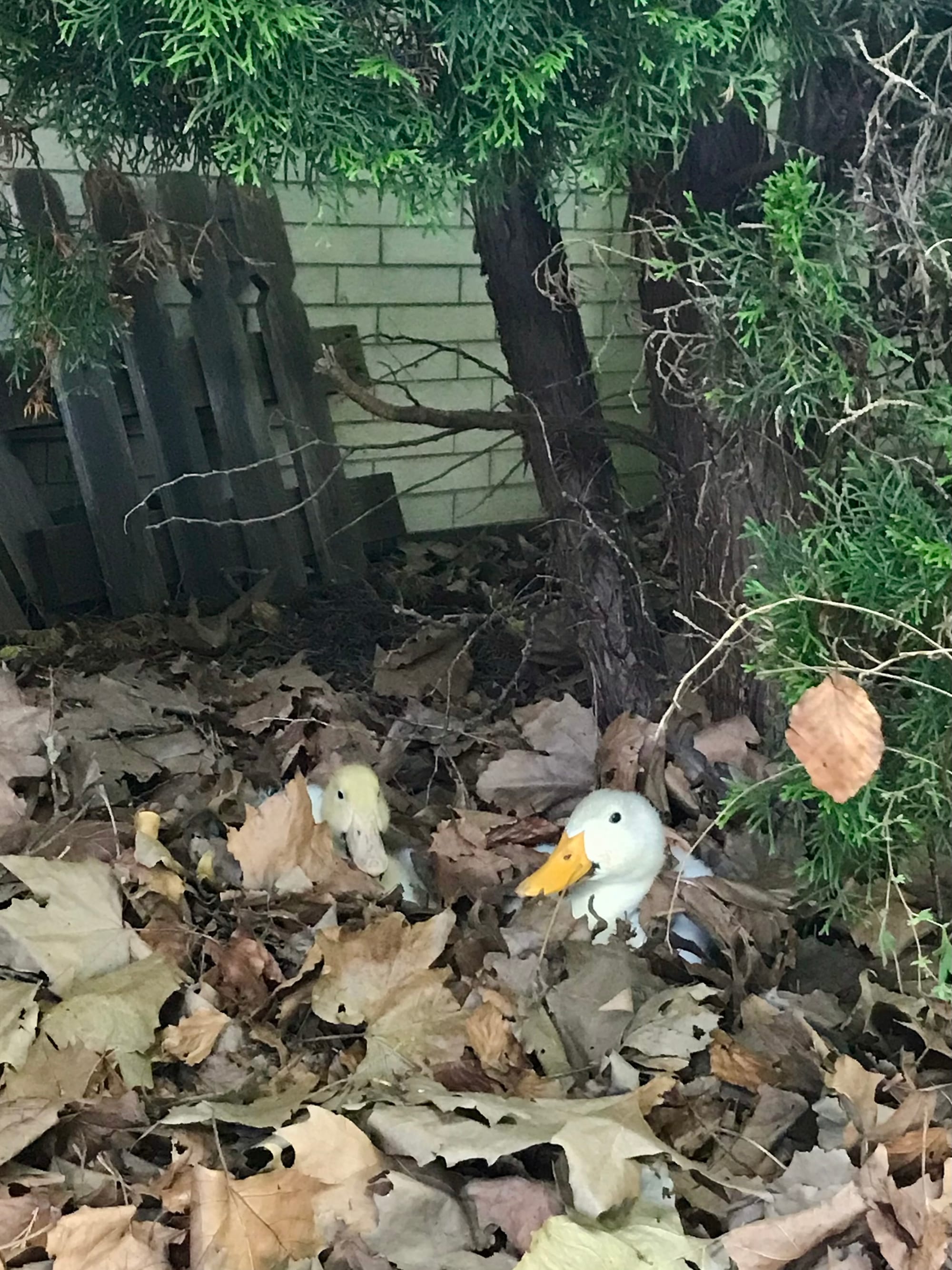 So sind wir zwei nun (im Regen) mit Taschenlampe durch den Garten gelaufen, haben die Büsche und das Laub durchsucht – keine Ente da. Die Stimmung sank immer weiter.